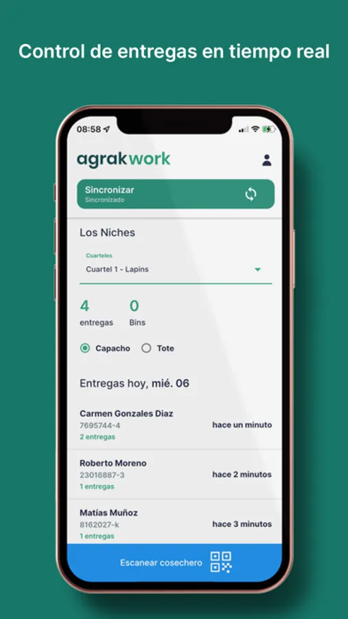 Crea cosechas con cuarteles y variedades personalizadas. Sirve para cosechas de Cerezas, Arándanos, Manzanas, Kiwis, Limones, Paltas, Duraznos y mucho más! Ingresa cosecheros al sistema en terreno asociándose a un código QR. Mejora la calidad de tu fruta y lleva una trazabilidad de tus bins. Reportería mobile en línea descargable.