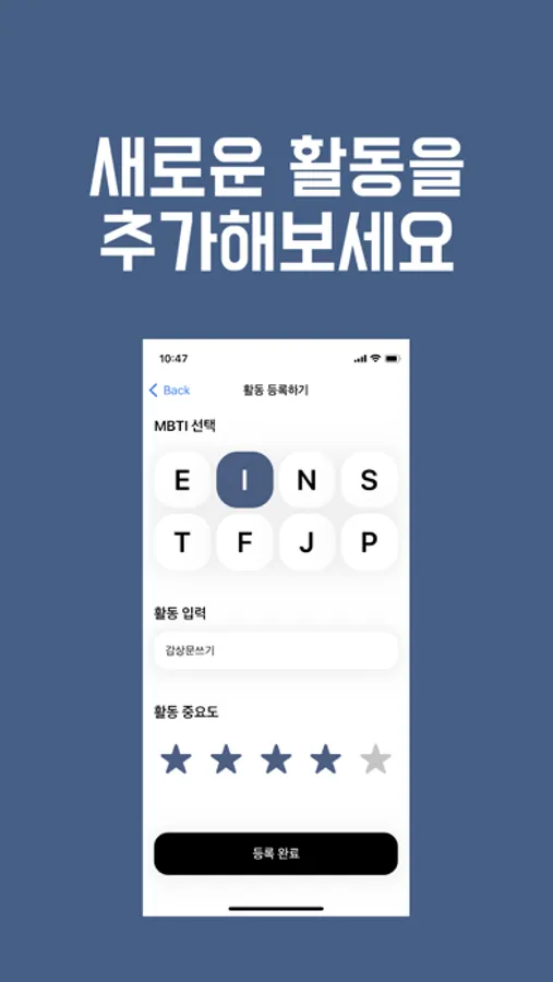 - 본인의 현재 MBTI와 목표 MBTI를 설정하고, 활동을 추가해보세요.