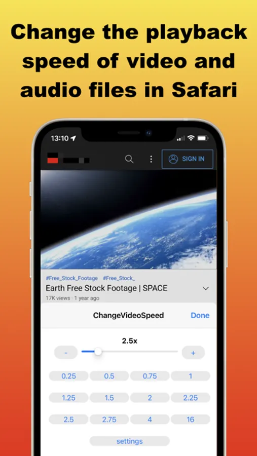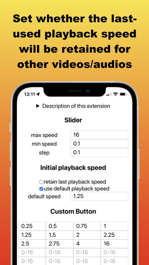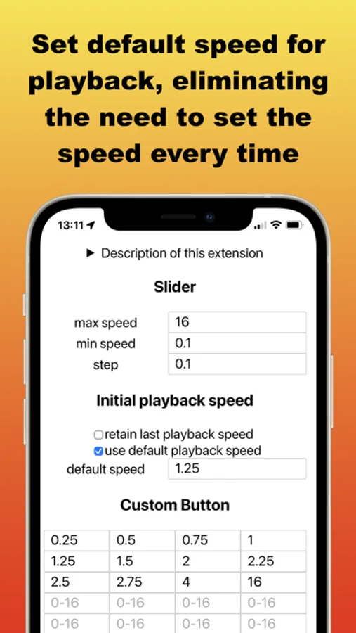 ・Change the playback speed of web videos/audios up to 16x the original speed.