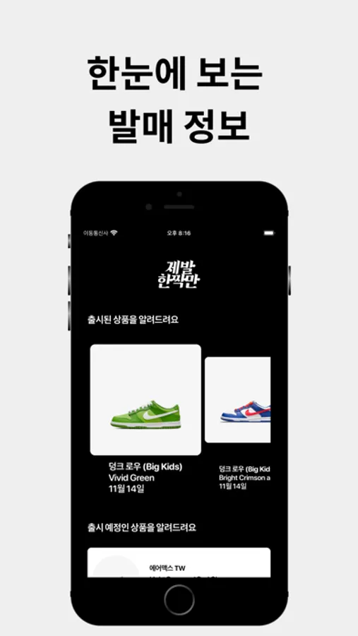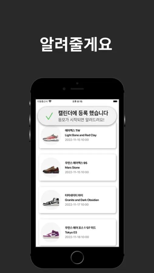 한정판 스니커즈 발매 정보와 바로가기, 알림설정 을 제공하는 서비스입니다.