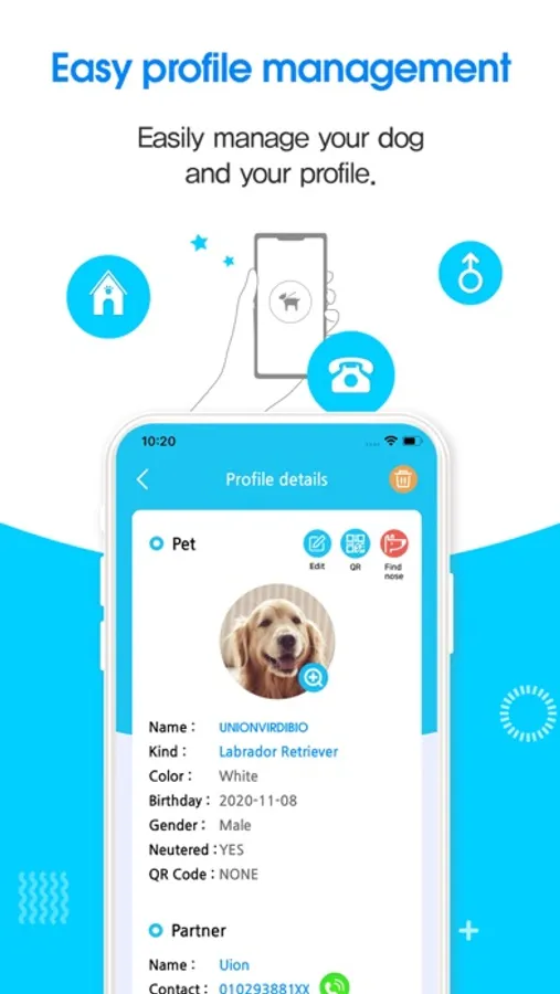 You can easily register your dog's information through the unique nose print that exists on the dog's nose. If your dog is lost, you can report the loss and use the lost dog search service.