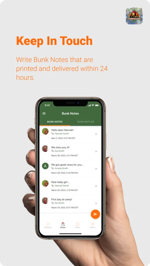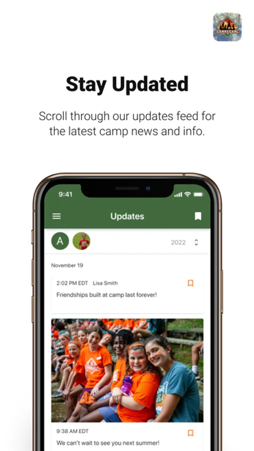 Stay connected with the Camp Carl app! Send Bunk Notes to your camper that will be hand delivered to them each day. See all the photos Camp Carl uploads during the camp week and get notified whenever photos of your camper are detected. Check in with camp daily with the Updates Feed to see photos, videos and status updates that give you a front row seat to camp life. You can opt in to receive notifications about your camper delivered instantly to your phone. Designed for parents and families to be the first to know what's happening at camp this summer and beyond.