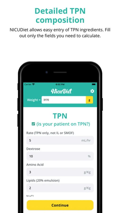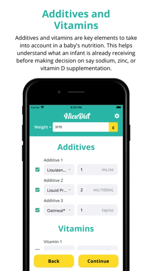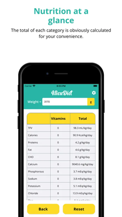 NICUDiet aims to make this process easy. By simply entering what a baby is being fed (TPN, enteral feeds, supplements and vitamins) NICUDiet will generate a thorough breakdown of over 10 components of a newborn's nutrition. Total fluid volume, calories, sodium content, iron, zinc, vitamin A, vitamin D and so much more.