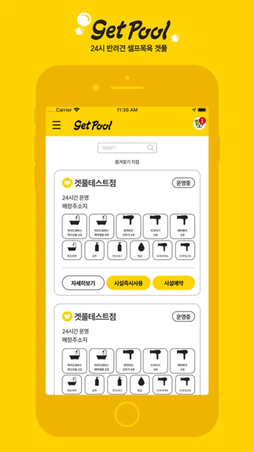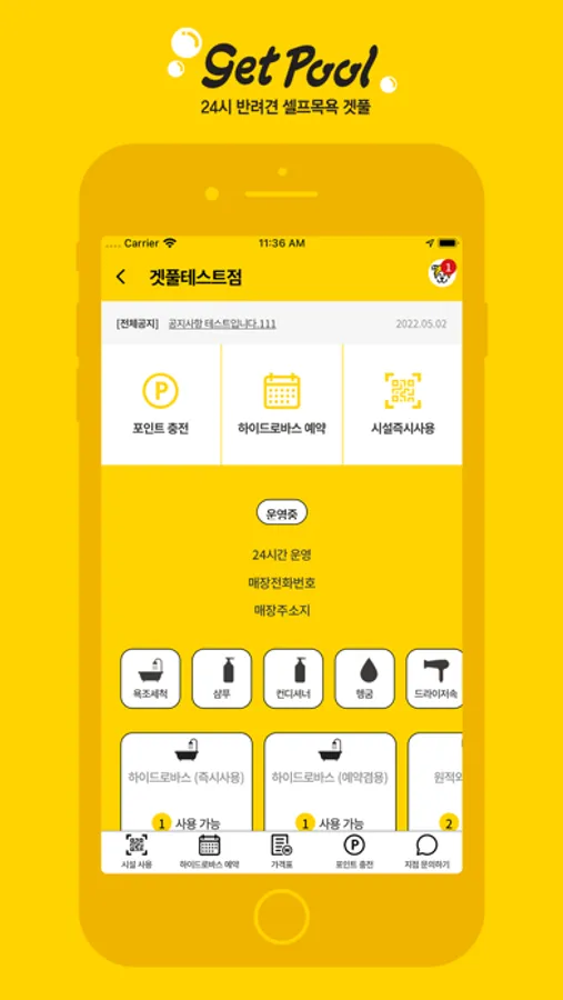※해당 APP은 현재 겟풀 남양주점에서만 APP 사용 가능합니다. 타 지점은 서비스 오픈 준비 중에 있습니다.24시간 무인으로 운영되는 반려동물 셀프 목욕시설 겟풀(GetPool)입니다.