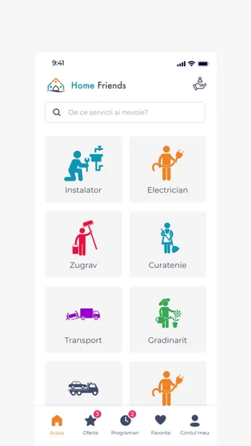 O aplicație prietenoasă și gratuită, prin Home Friends găsești sute de experți în vecinătatea ta, pregătiți să te ajute cu treburile casnice. Fie că ai nevoie de curățenie, electricieni, instalatori, zugravi, ajutor cu mutatul mobilei sau cu îngrijirea grădinii tale, acum te poți bucura de confort fără efort, cu un singur click.