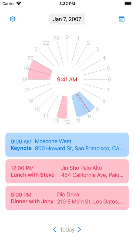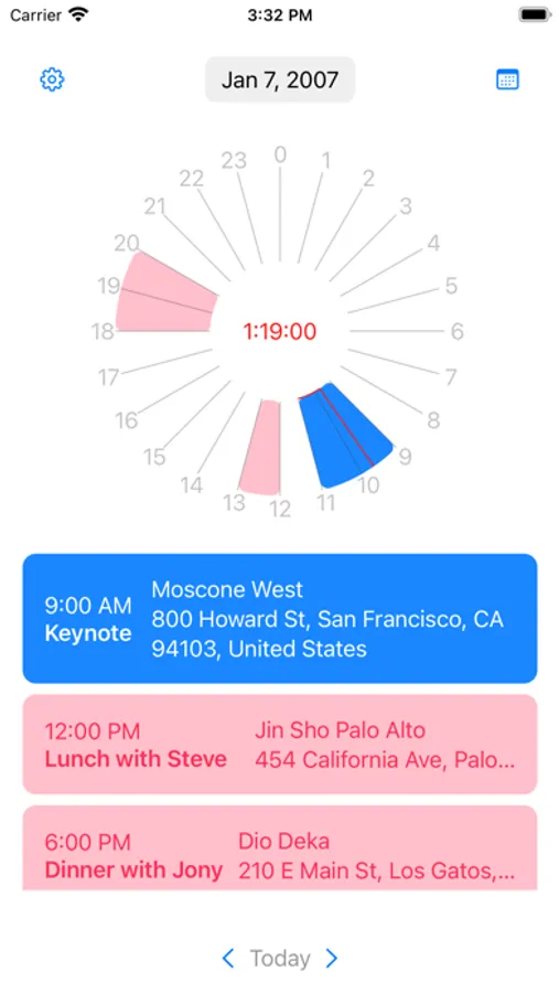 Dodeka show's a day's events in a single 24-hour watchface. See how busy your day is at a glance. Monitor how long you have until the next meeting, or how long it's been since the last one, by selecting it.