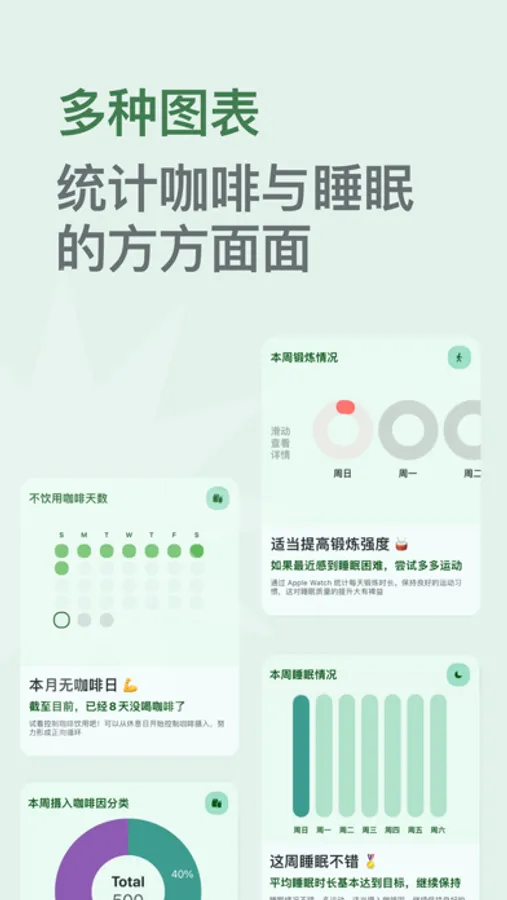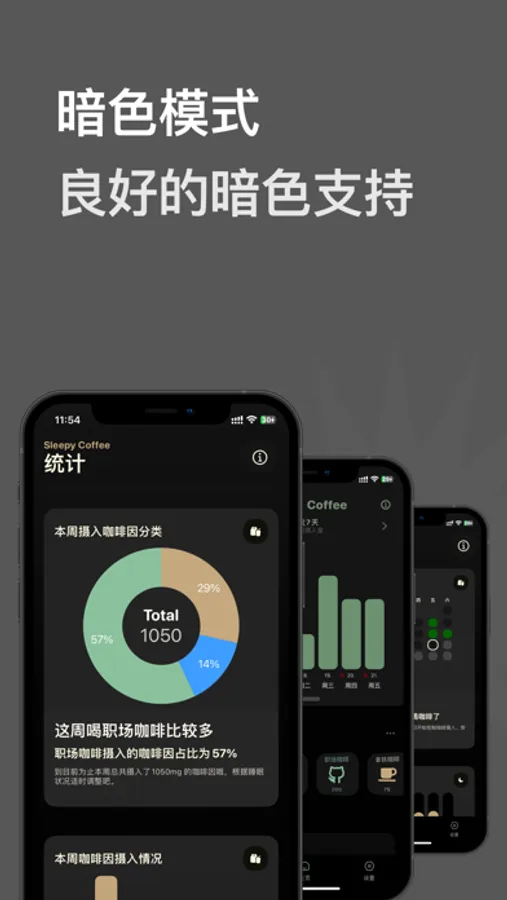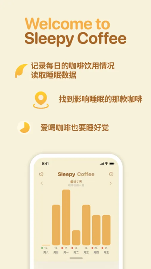 让Sleepy Coffee与你一起,记录咖啡饮用情况并读取你的睡眠数据,揭开咖啡与睡眠的关系,从而适度调整生活习惯,让爱喝咖啡的你也能睡好觉~