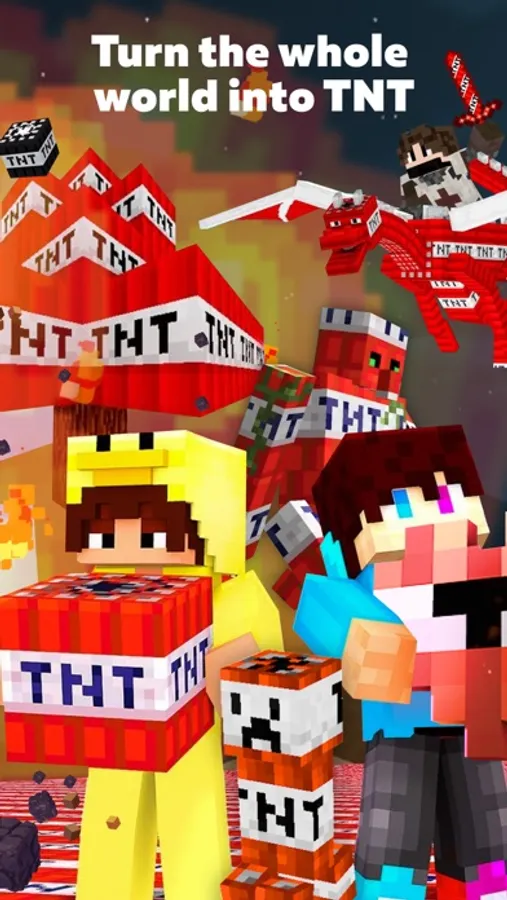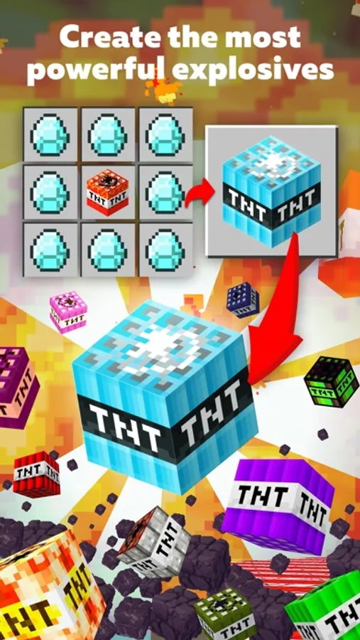 Join a multi-faceted adventure with a collection of explosive blocks and clear your way by destroying evil creepers and erasing everything unnecessary from the surface of the virtual world. With the help of TNT, you can easily extract useful resources in mines, create original structures, turn biomes into a post-apocalyptic wasteland, or increase your chances of winning in furious team battles by setting dynamite on the battlefield as a mine or a trap. The explosion occurs 4 seconds after pressing the button or lever. Add a real rain of falling TNT, destroying everything in its path. Use sticks of dynamite - an enhanced version of TNT, which has increased damage and a larger radius of destruction. The application will add to the game a whole collection of new TNT blocks with different powers and different principles of action. Transform the classic gameplay and start the total destruction of the virtual universe.