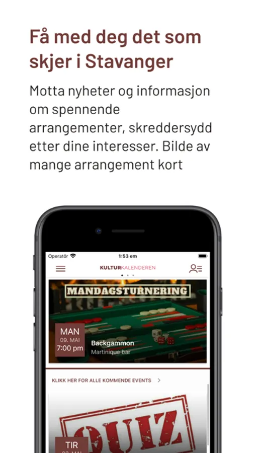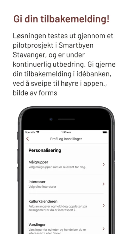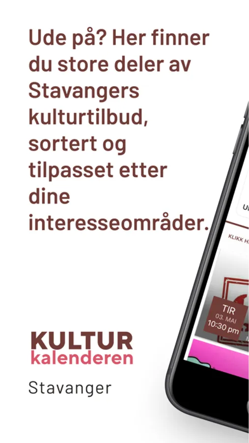 Ude på? I kulturkalender appen finner du store deler av Stavangers kulturliv, sortert og tilpasset etter dine interesseområder. Her er det du som bestemmer innholdet, slik at det blir relevant for deg. Følg de arrangørene du ønsker å motta nyheter og arrangementsinfo fra, så slipper du å gå glipp av hva som skjer! Løsningen har som mål å bli en felles digital kulturkalender i Stavanger, og på sikt i regionen. Her skal vi samle alt som skjer, og gjøre kulturtilbudet oversiktlig og tilgjengelig for mennesker i alle aldre. Løsningen testes ut gjennom et pilotprosjekt i Smartbyen Stavanger, og er under kontinuerlig utbedring. Gi gjerne din tilbakemelding i idébanken, ved å sveipe til høyre i appen.