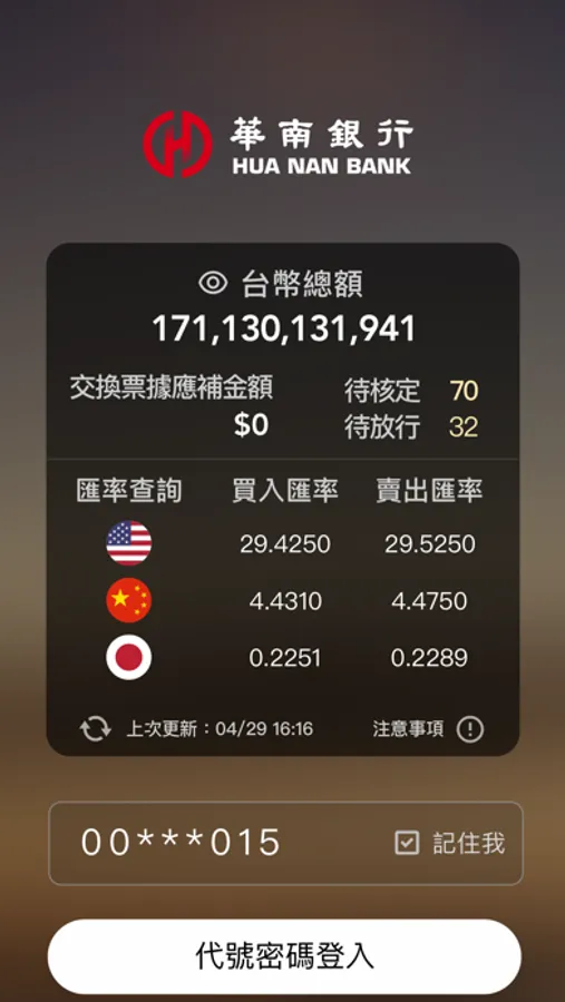 →企業客戶事前約定免登入,快速得知臺幣總額、即期匯率、待核放筆數及票據提回金額。