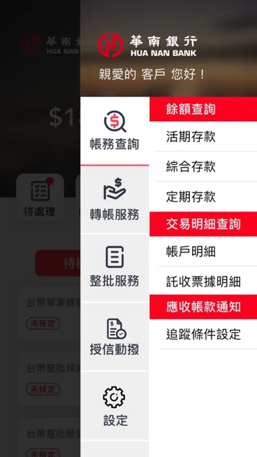→提供臺幣、外幣暨託收票據總覽、存款交易明細,並支援集團查詢功能。