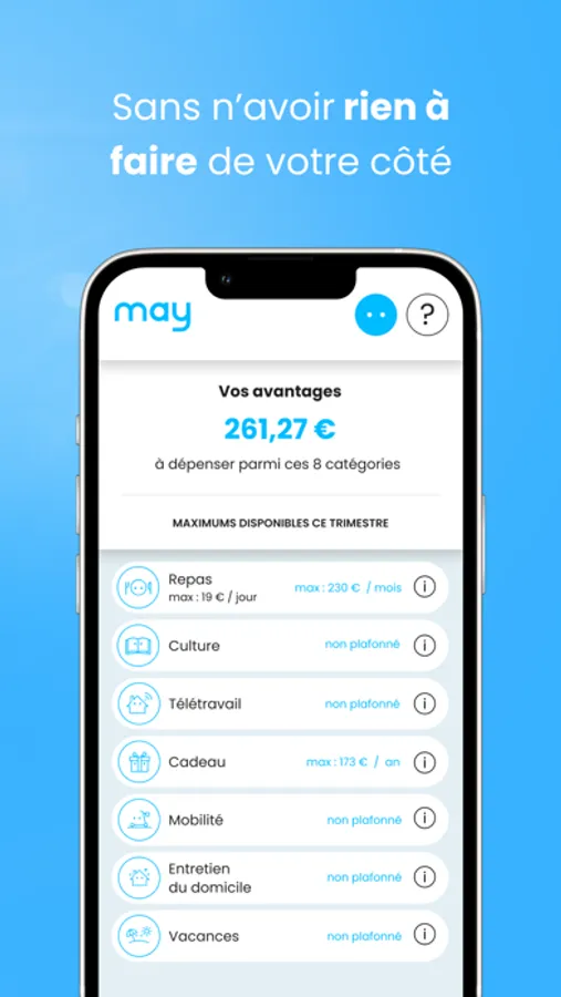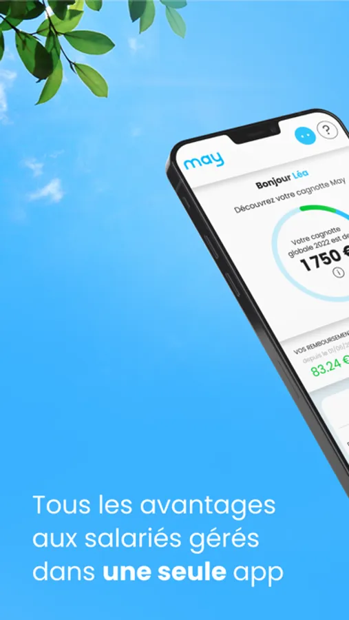 May, c’est l’App qui permet de profiter pleinement et librement de tous ses avantages aux salariés : titres repas, titres cadeaux, chèques vacances, chèques emploi service, chèques sport, mobilité… Tous les avantages gérés dans une seule App, et directement remboursés sur votre compte en banque, sans n’avoir rien à faire de votre côté, sauf bien sur installer l’App.