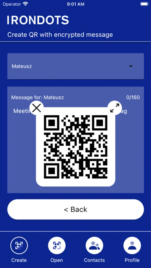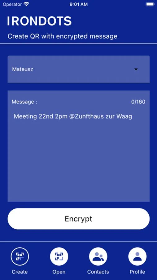 IRONDOTS allows you to encrypt & decrypt messages into / from a QR code.