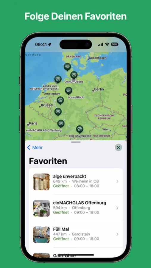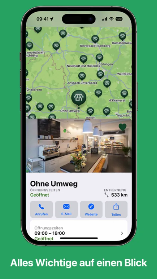 In the detail view you can browse through their assortment, get information about opening hours and mark your personal favorites. Write a message to your favorite unpacked store, give them a call or simply drop by directly.