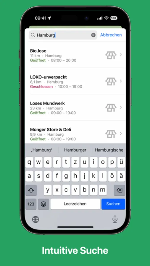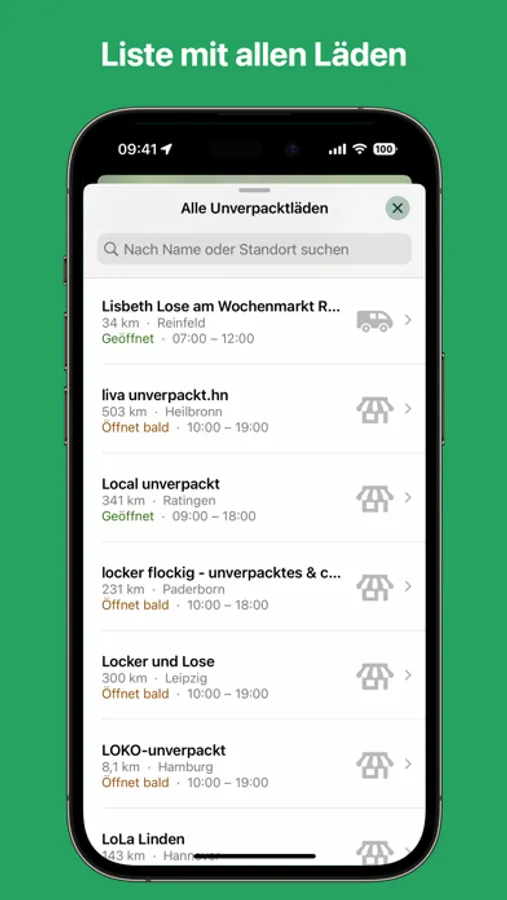 Show your location on the map and see how far the unpackaged stores are away from you at a glance. With the integrated search you can filter all stores based on name or location and also see if they are currently open and how far away they are.