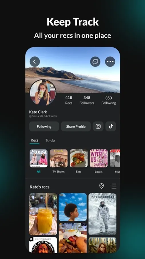 - Save your friends' recs to your personal to-do list and keep track of the recs you’ve discovered on Reckit