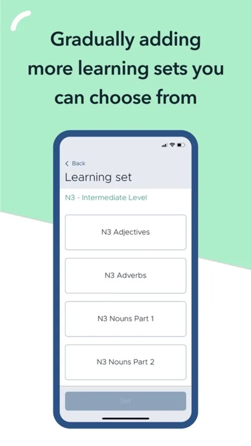 Learning sets - both language level based (N5 to N1) and topic based (e.g. Food). New learning sets are added regularly.