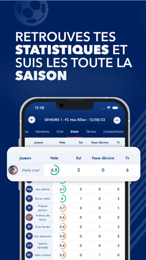 Facilitez la collecte de statistiques pour votre équipe et profitez de tous les classements entre joueurs de manière automatique : classement des buteurs, des passeurs, des cartons jaunes ...