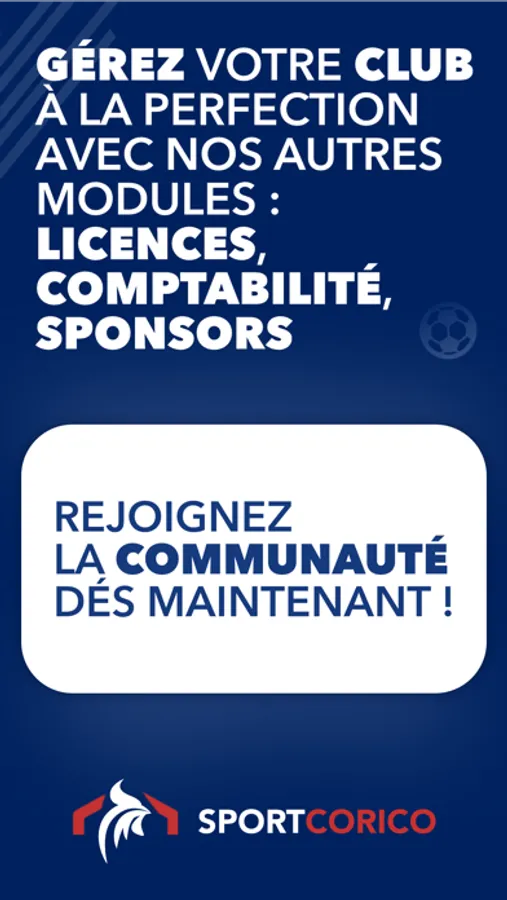 Les fonctionnalités sur la gestion des clubs nécessitent la création d'un compte SportCorico. Vous pouvez alors rejoindre votre club et vous simplifier la vie !