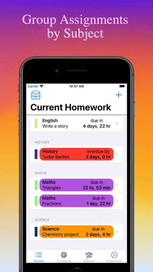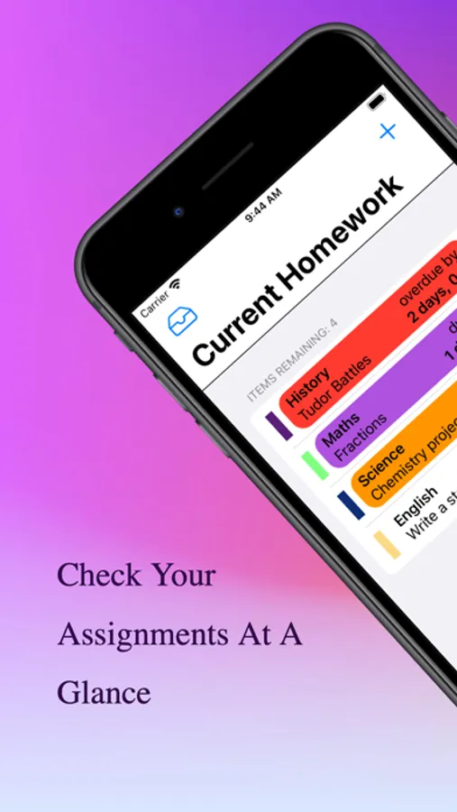 Powerful yet simple. Just add your subjects, and then add your homework items! You'll be reminded at 4 pm the day before the homework is due. Update the due date, and the reminder will be automatically re-adjusted. Your items will automatically change colour as the deadline approaches, from Clear, through Amber to Purple and finally Red if the item becomes overdue.