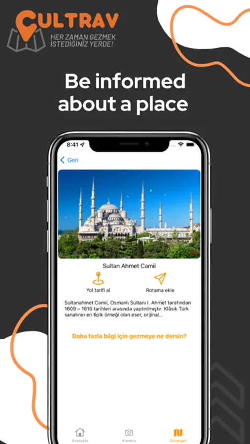 Cultrav is a "tourist guide" application. We not only inform you while traveling but also strive to provide you with the best travel experience before, during, and after your travel. By using image processing and artificial intelligence technology, we not only make the trip fun but also give you the pleasure of reaching the right information in a short time.