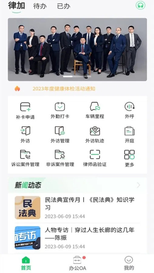 律加APP是一款OA办公系统移动端APP,可支持多款应用组合使用,拥有车辆里程应用、手机外呼应用、外访APP应用、外勤打卡应用、流程申请应用、办公OA应用等七大应用服务
