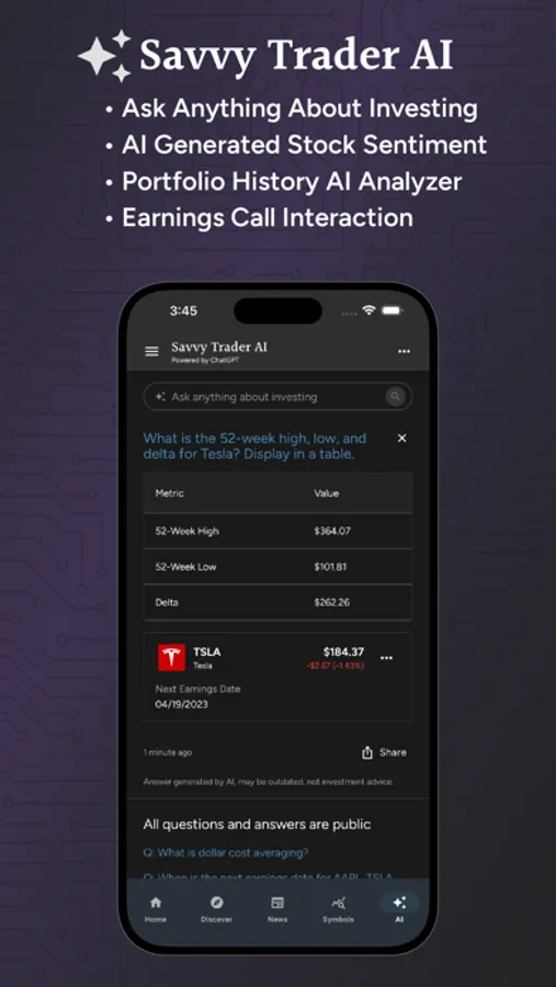 Savvy Trader AI combines the power of ChatGPT with Savvy Trader for stocks and investing related questions.