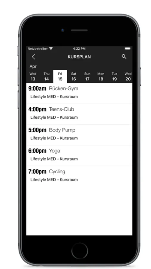 Yoga, Step oder Indoor Cycling – Sie haben Lust auf Bewegung, wissen aber nicht, welche Kurse heute im Programm sind? Dafür haben Sie nun die Lifestyle MED-App. Halten Sie aktuelle Gruppenkurspläne stets griffbereit und machen Sie spontan mit oder planen Sie, welche Kurse am besten in Ihren persönlichen Zeitplan passen. Sie wissen nicht, was hinter den Kursnamen steckt? Keine Sorge, neben Details wie Zeit und Ort des Kurses, können Sie auch Kurzbeschreibungen einsehen und sich dann für Ihre Lieblingskurse entscheiden.