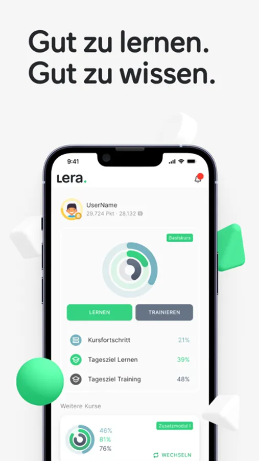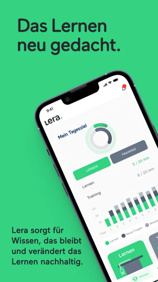 Lera generiert für jede/n User:in einen individuellen Lernplan – je nachdem, wie viel Zeit man sich nehmen will oder welche Lernmethoden man bevorzugt. Innerhalb von Micro-Learning-Einheiten wird das Wissen schlüssig vermittelt und im Rahmen von Spaced Repetition eingängig wiederholt.