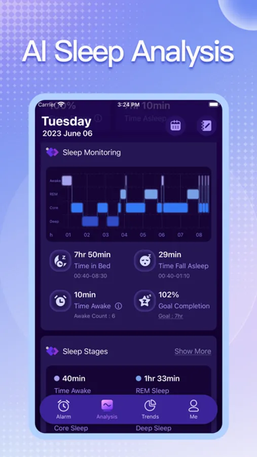 We use a neural network algorithm to analyze your sleep cycle more accurately to generate a sleep monitoring chart, which also includes information such as your bed rest time, time to fall asleep, wake-up time, number of wake-up times, and sleep goal completion.