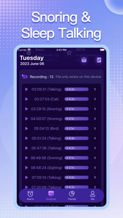 We display your sleep recordings according to the timeline to maximize sleep reproduction. We have recorded a variety of sleep sounds, including snoring, sleep talking, walking, coughing, sneezing, turning over, sighing, cats, dogs, birds , rooster crowing, etc., and all recording files are only stored in your mobile phone, so you don't need to worry about your sleep recording being leaked.
