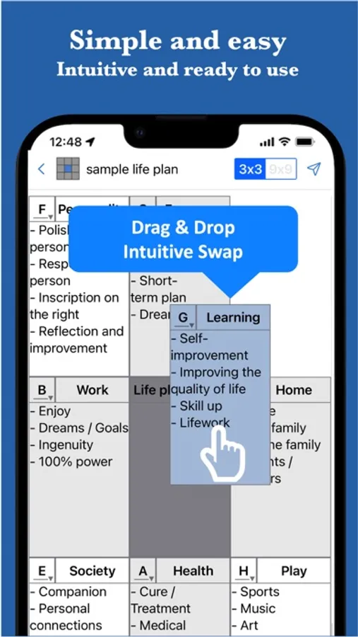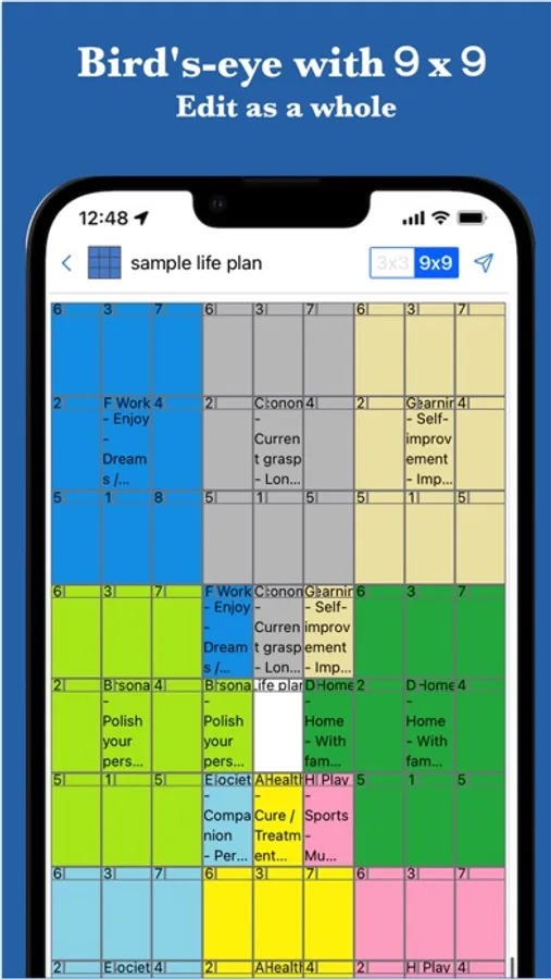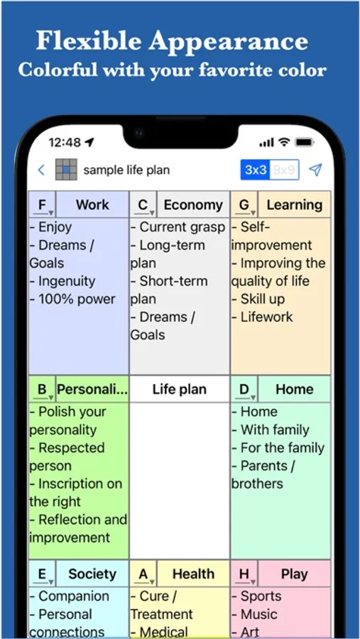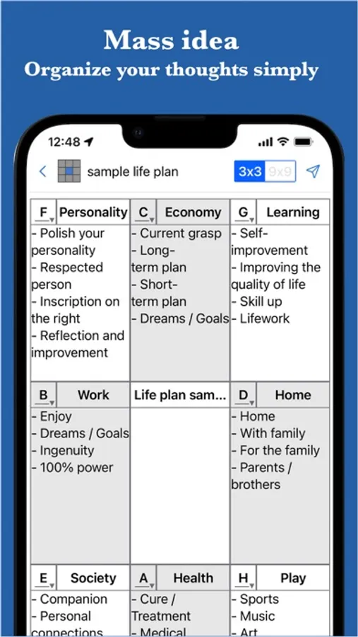The 9 Box Thinking MandalaChart allows you to simply organize your thoughts, remember things, and set goals and plans.