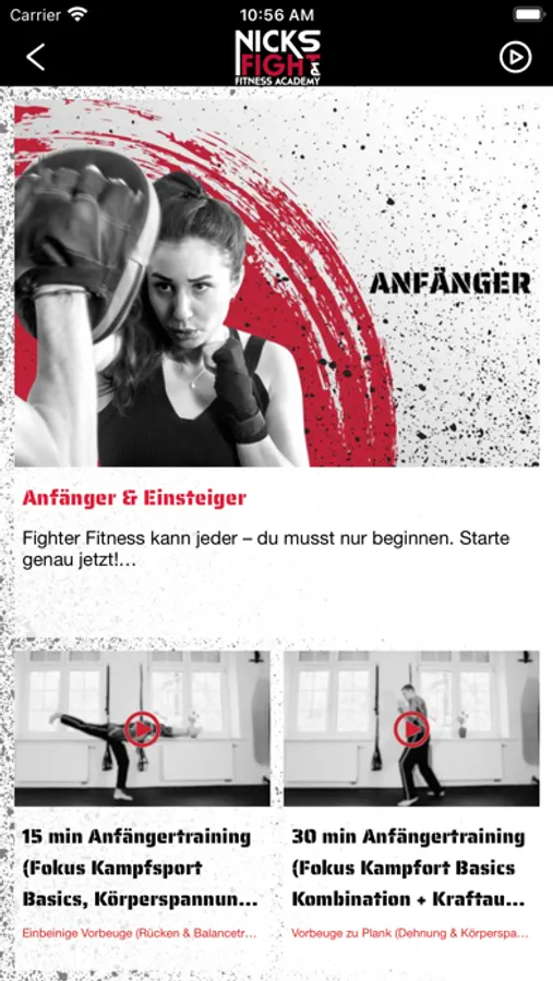 Hier hast du die Möglichkeit, immer und überall an deiner Fitness zu arbeiten. Trainiere allein und individuell mit der App UND gemeinsam mit uns im Team in unseren regelmäßigen Live-Workouts. Bei uns geht beides. Mit motivierendem Video-Content und einer großen Auswahl an vielfältigen Übungen, ermöglicht dir Fighter Fitness die perfekte Einbindung in deinen Alltag. Ganz gleich ob du Anfänger bist oder dich schon auskennst, hier findest du alles, was du für ein vollwertiges Workout brauchst. Kampfsport, Kraft, Beweglichkeit und Mindset sind nur eine Auswahl unserer Bereiche, in der dich Fighter Fitness stark macht.