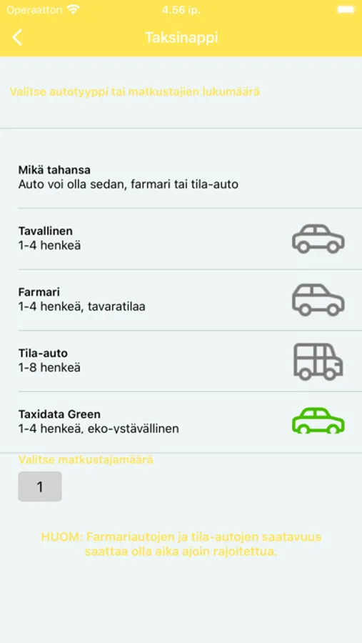 Voit valita auton oman matkustamiseesi sopivan taksin tilanteen mukaan, 1-4 hlö tai 4-8 hlö.
