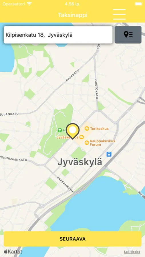Taksinappi sovelluksella tilaa taksin aina vaivatta ilman jonoja tai turhaa odottelua. Valitse sovellukseen vähintään noutopaikkasi tai voit tietysti valita valmiin reitinkin. Taksinappi sovelluksella seuraat taksisi saapumista ja tilauksen kulkua sekä saat arvion taksin saapumisajasta. Taksinappi sovellukseen voit lisätä myös maksukorttisi matkan maksamista varten tai maksaa matkan perinteisempään tapaan taksissa.