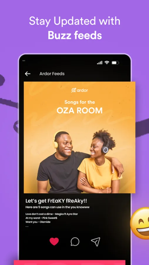 Gives you access to interesting and juicy gist from Ardor. Share your love stories and experiences anonymously or not via feeds@ardor.africa