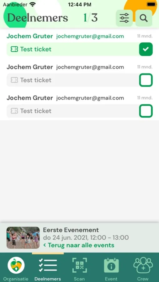 Het inchecken van deelnemers kan op twee manieren: handmatig via de deelnemerslijst of via de camera QR scanner om de QR code op de tickets te scannen. Via handige filters en zoekmogelijkheden heb je precies inzicht wie er wel en niet is ingecheckt en welk type tickets deelnemers hebben gekocht.