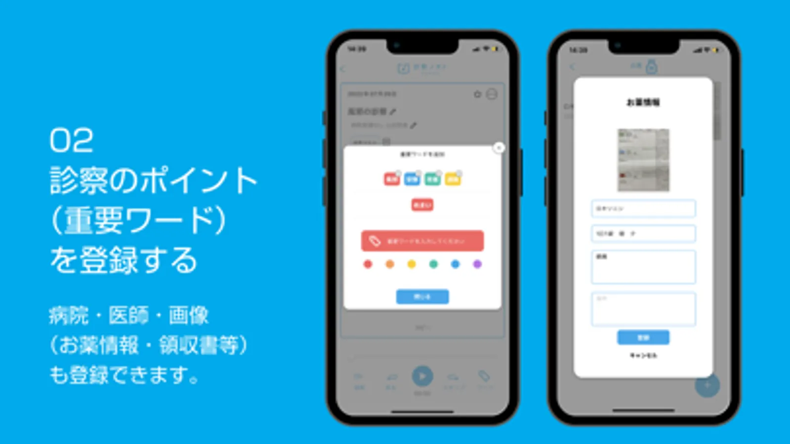 診察内容で自分が重要だと感じたポイントを登録することができます。また、重要ワードには数値を入力することができるため、経過観察する数値を診察ごとに記録しておくことができます。