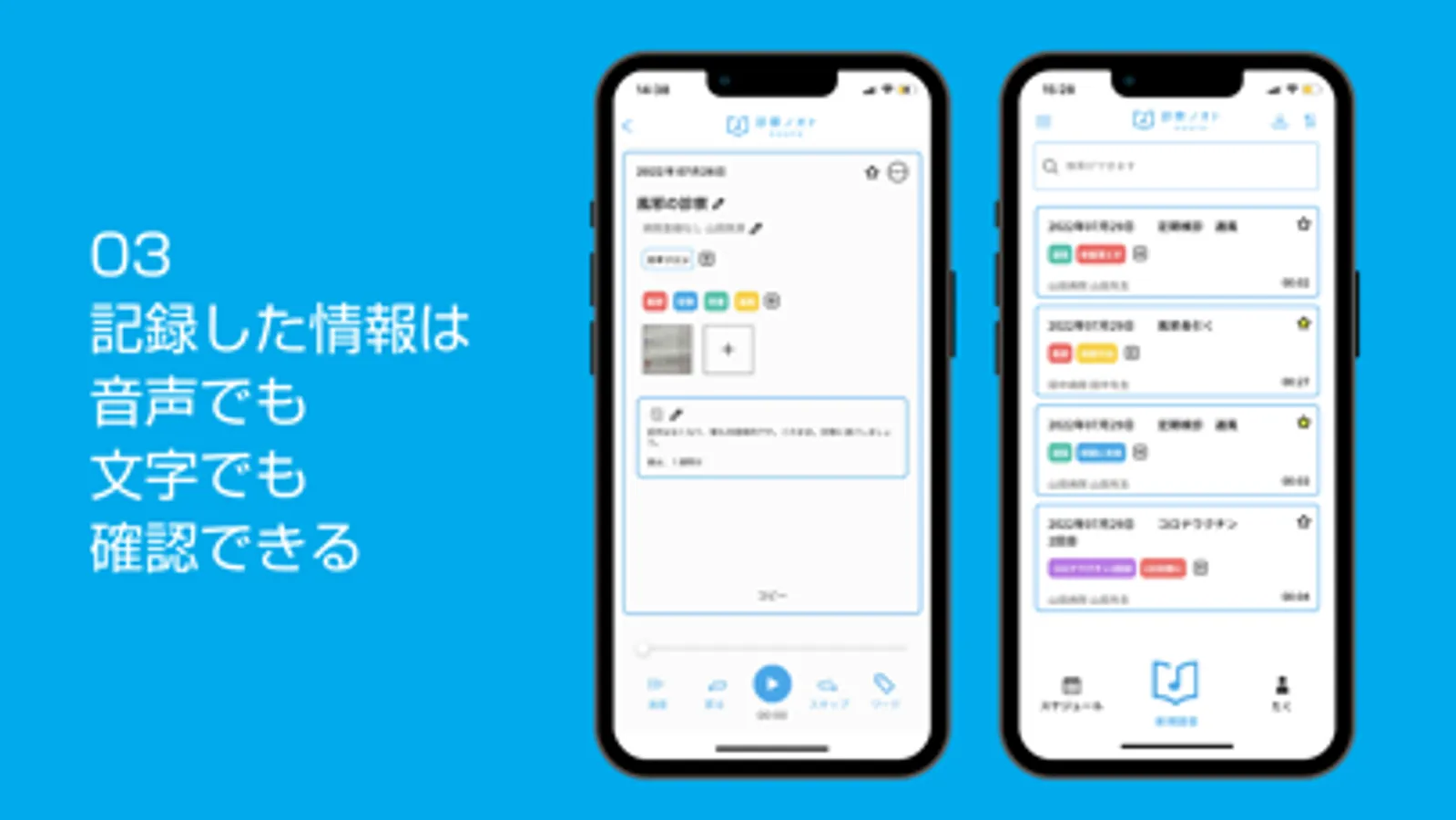 「診察ノオト」があれば、「医師との会話・診察内容」という健康改善にもっとも重要な情報を、忘れずに、後からでも見返すことができのです。