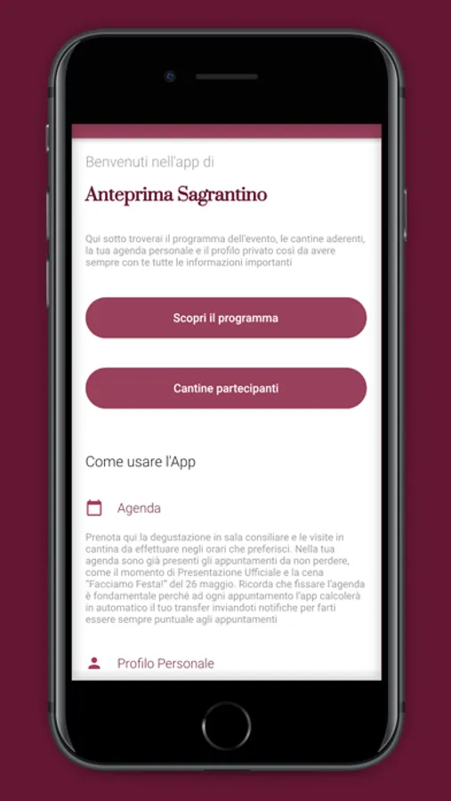 Scopri il programma dell’evento, le cantine aderenti, la tua agenda personale e il profilo privato per avere sempre con te tutte le informazioni importanti.