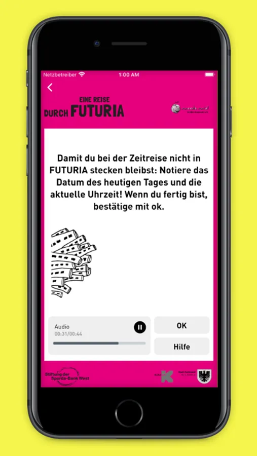 Der interaktive Audiorundgang nimmt alle Menschen ab 7 Jahren mit auf eine spannende Reise in die Zukunft. Ausgestattet mit Reiseausrüstung und einem Reisetagebuch sind alle Reisende eingeladen zu forschen und zu entdecken. Sie passieren Zeitschranken, reisen mühelos durch die Zeiten hin und her und entdecken dabei mögliche und unmögliche Zukünfte. Wie werden wir Menschen in Zukunft wohnen? Wie werden wir uns ernähren, wie uns fortbewegen? Wird es zu viel oder zu wenig Wasser geben? Wie wird sich das Klima ändern?