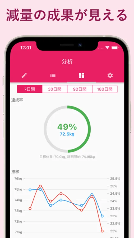設定タブで目標体重を入力すると、目標体重までの達成率を表示することができます。