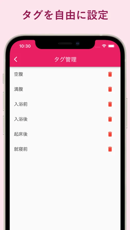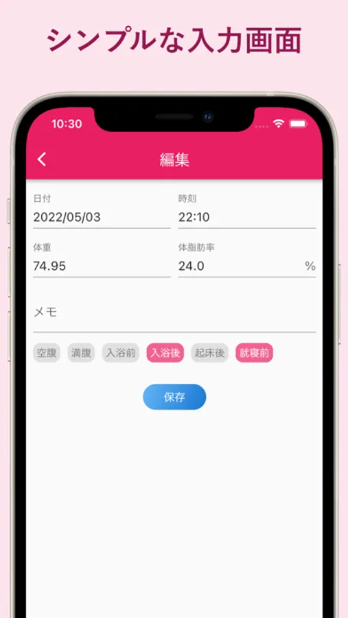 また、タブを自由にカスタマイズすることで、体重計測時の状態を簡単に記録することができます。