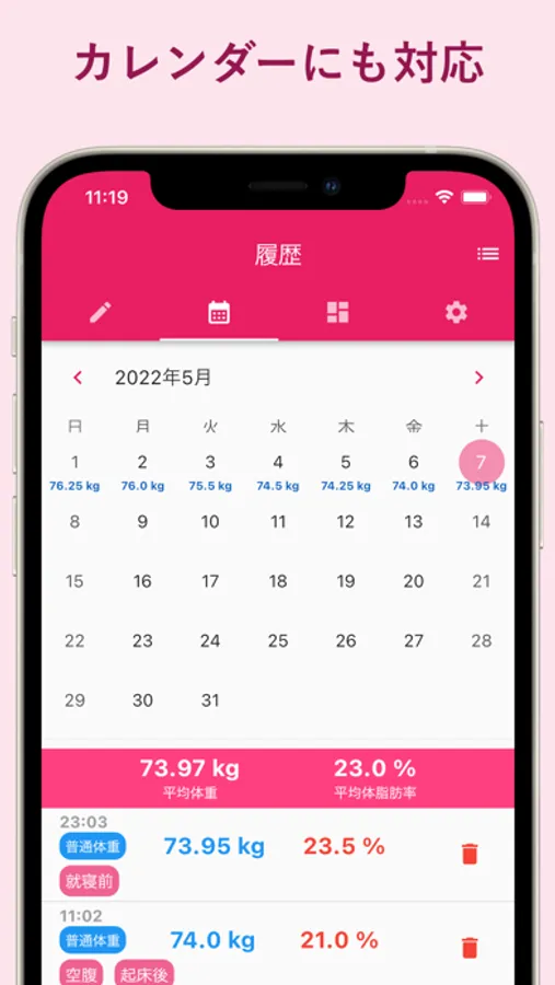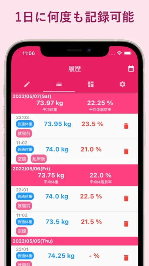 1日に複数回記録した場合は1日の平均体重と平均体脂肪率も表示されます。