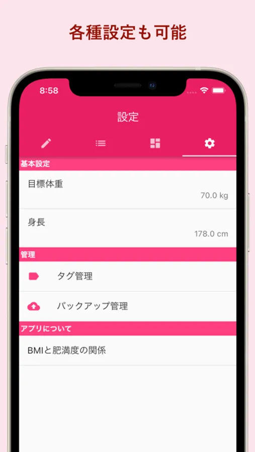 設定タブで身長を入力すると、BMIを元にした肥満度も表示可能です。