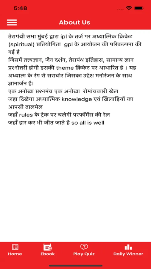 जिसमें तत्त्वज्ञान, जैन दर्शन, तेरापंथ इतिहास, सामान्य ज्ञान प्रश्नोत्तरी होगी इसकी theme क्रिकेट पर आधारित है । यह अध्यात्म के रंग से सराबोर जिसका उद्देश मनोरंजन के साथ ज्ञानार्जन है।