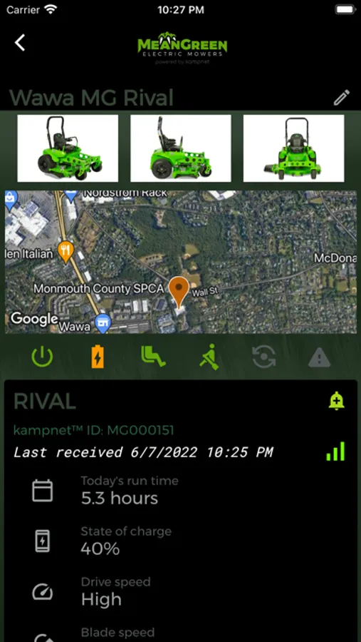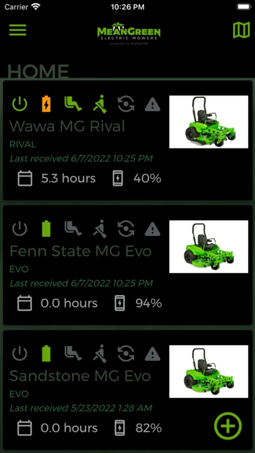 The Mean Green Connect mobile app, powered by kampnet™, allows you to stay in the know at all times and from anywhere… Thanks to an easy and guided profile creation you'll be able to add as many kampnet™ connected Mean Green mowers to your fleet and monitor them right from your smartphone. Only model specific and applicable telemetry measures will be displayed in the app. Some examples are listed below: [:mav: 1.8.0]