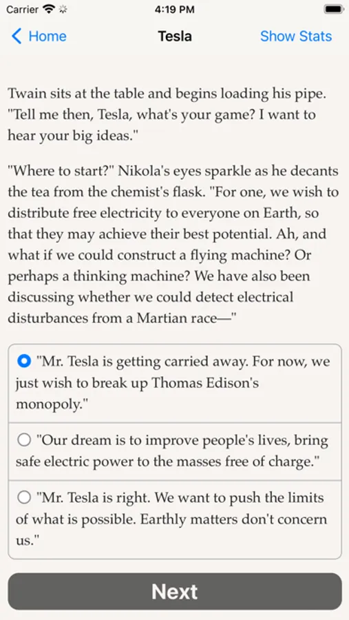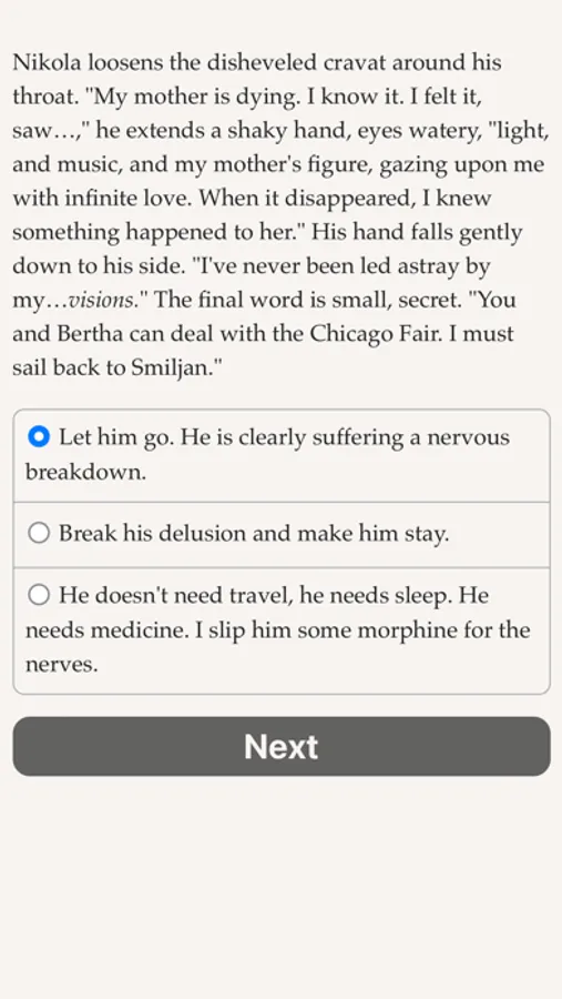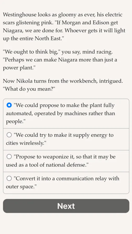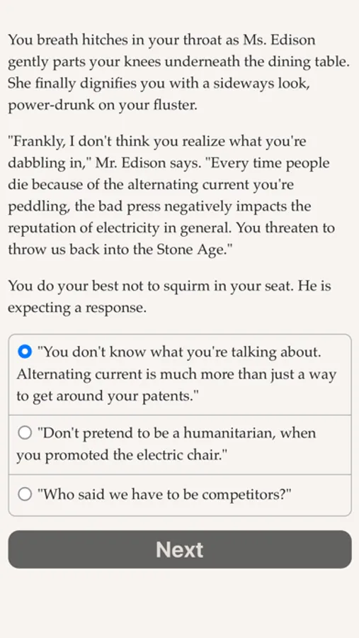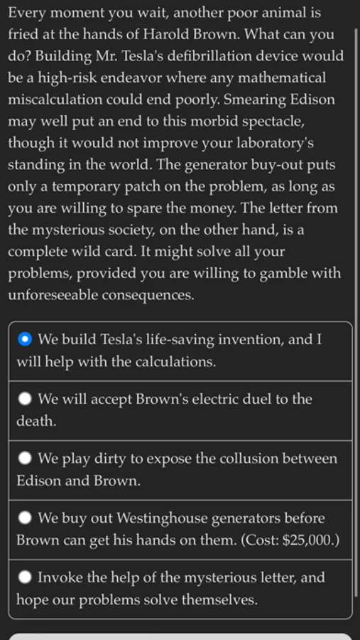 "Nikola Tesla: War of the Currents" is a 225,000-word interactive science-fiction novel by Dora Klindžić. It's entirely text-based, without graphics or sound effects, and fueled by the vast, unstoppable power of your imagination.