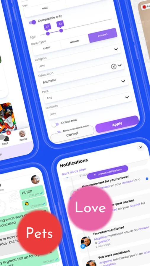 - Filtering by location, age, religion, education, pets, hobbies, and much more!