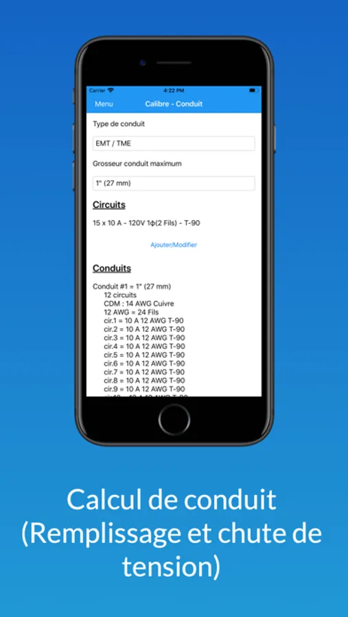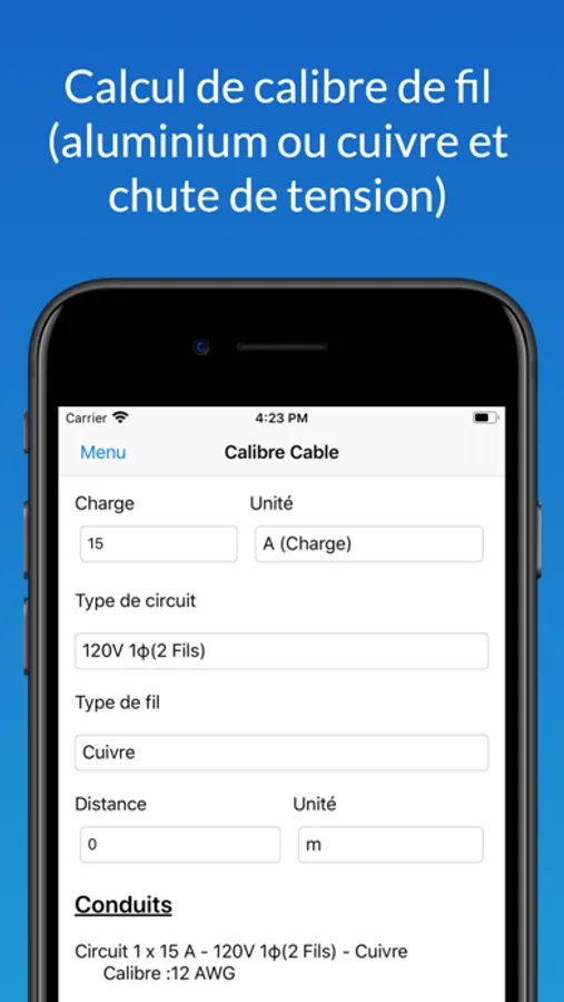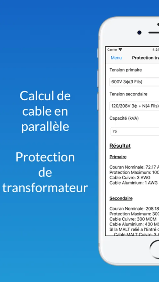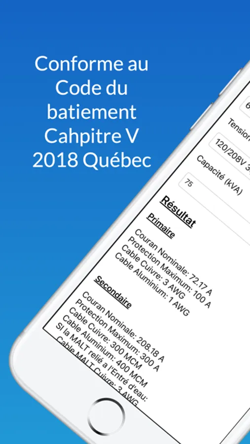 Application for electric calculation of wire gauge and much more. The app is intended to make electrical job planning easier as well as helping in estimation and design phase. All results are in accordance with Electrical Code in Québec Province. With the help of this application it will be easy for you to select the appropriate wire gauge, conduit size and protection device for motors and transformes.